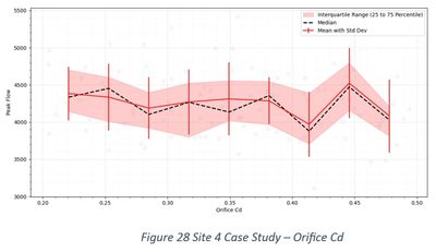 Binning orifice coefficient of discharge (Orifice Cd) found no obvious correlation between selected Orifice Cd and peak flow (Figure 28). As such a value of 0.3 was adopted.