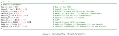 Within the command file, options are “SDF” for sunny day failure and “FFS” for flood failure scenario. Selecting SDF sets inflow as 0 for the full simulation duration while FFS triggers the dbase inflow file.