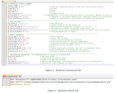 Included with Breacher and Breacher-Post are example set up files. Dam and breach parameters are specified in the Breacher command file and run by “calling” the command file and the Breacher executable with a batch file. See Figure 1and Figure 2.