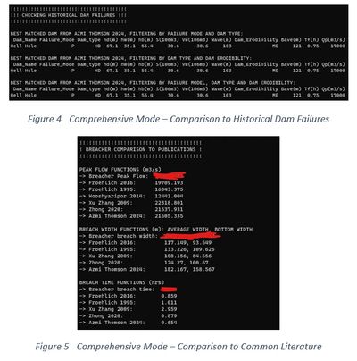 Within Breacher is a command to trigger a “Comprehensive” assessment, this allows for the simulation to be compared to a historical dam breach dataset (Azmi and Thomson, 2024) and breach parameters from other common literature.